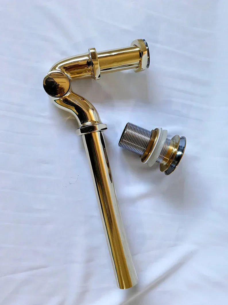 Solid Unlacquered Brass P-trap and Sink Stopper, Push Up Button, Pop Up Drain, Brass Water Trap